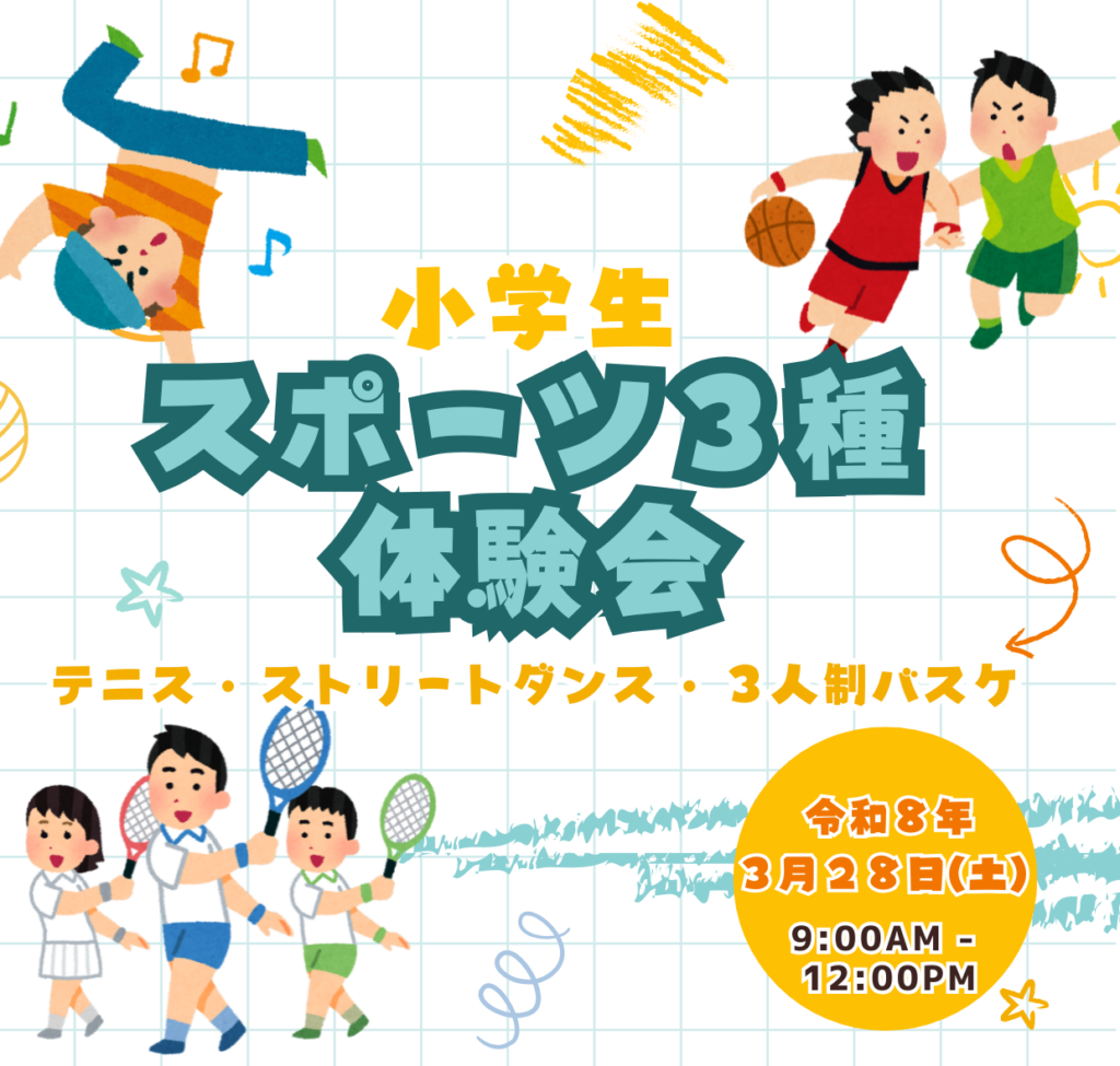 内 容:3種目(テニス、ストリートダンス(ブレイキン)、3人制バスケ(3×3))各45分のスポーツ体験教室✨