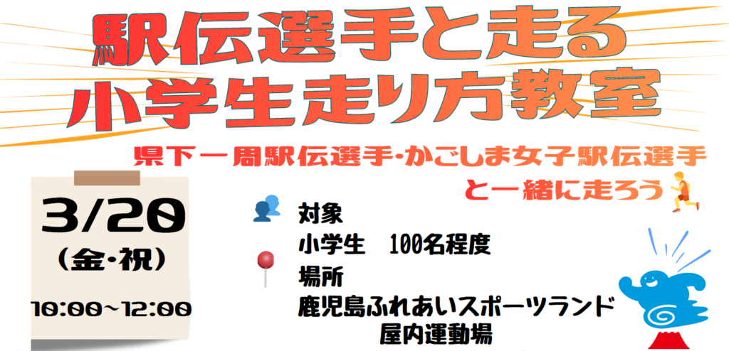 県下一周駅伝競走大会、県地区対抗女子駅伝競走大会鹿児島地区の監督、選手、コーチ等を講師に、小学生を対象にした走り方教室を実施することにより、駅伝に対する興味を深め、次世代選手の発掘、育成及び競技力の向上を図る。