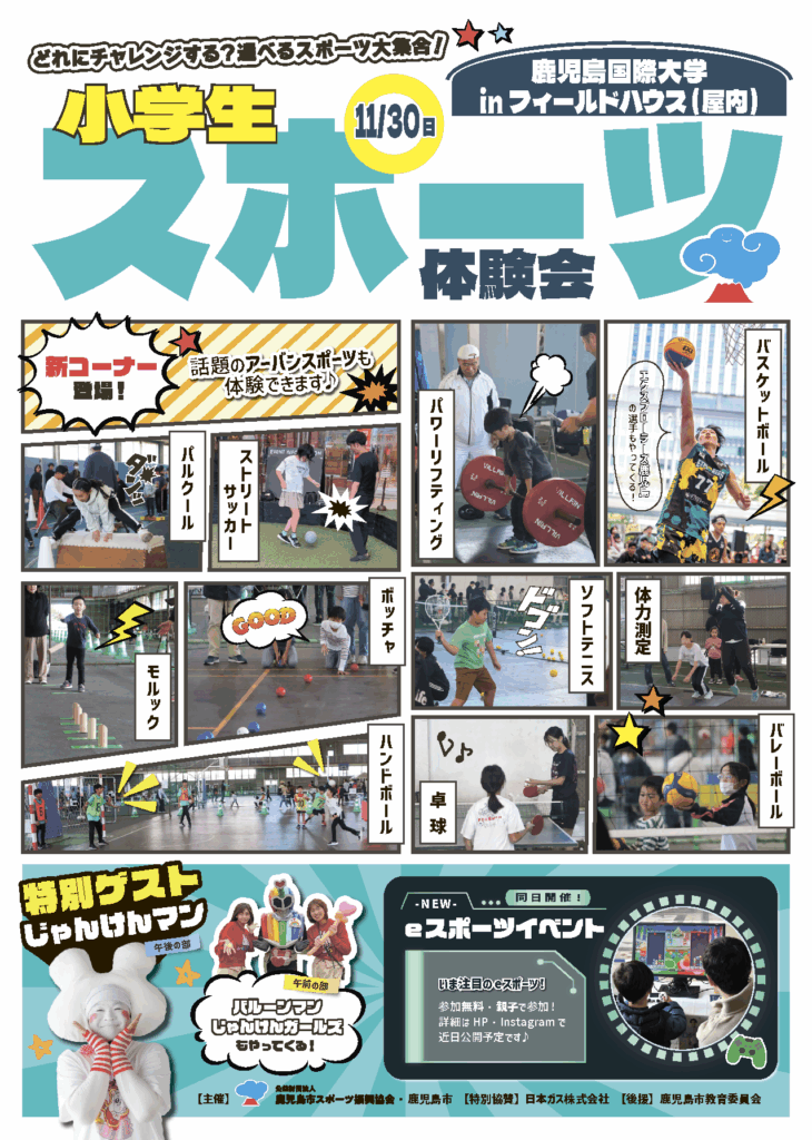 (〒891-0150 鹿児島県鹿児島市坂之上8丁目34) - 内容 小学生向けの競技体験イベント。18種目 + eスポーツ を準備しており、様々なスポーツへの興味・関心を持つきっかけを創出する。